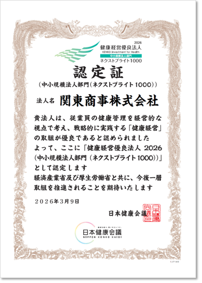 当社では、社員一人ひとりが健康で個々の能力を発揮できるよう、健康増進による取り組みを積極的に行っており、経済産業省と日本健康会議が進める健康経営優良法人として3年連続で認定されました。(2026年3月9日取得)
